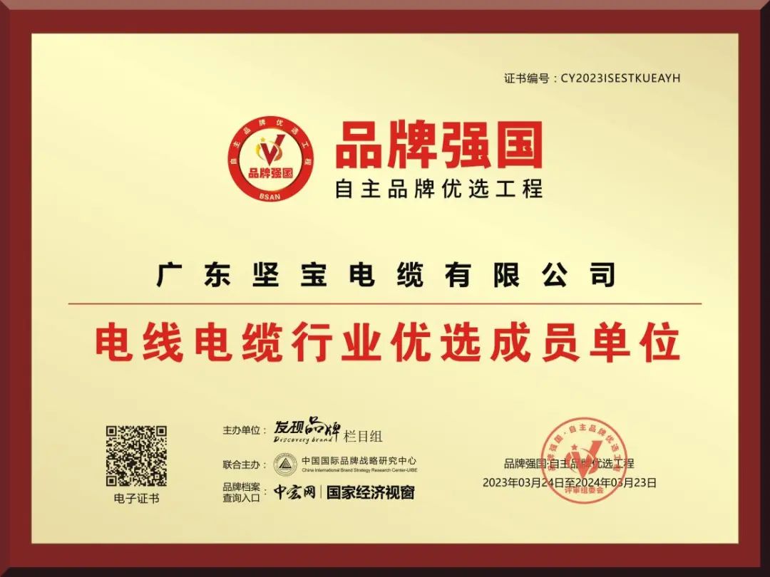 經(jīng)由品牌強國自主品牌優(yōu)選工程運營(yíng)中心審核、認證、社會(huì )公示,“堅寶電纜”符合優(yōu)選工程評選標準,成功入選為品牌強國主品牌優(yōu)選工程——電線(xiàn)電纜行業(yè)品牌強國成員單位并在國家經(jīng)濟視窗“中宏網(wǎng)”建檔備案。企業(yè)信息錄入品牌強國主品牌優(yōu)選工程數據庫,在國家級平臺展示品牌形象。