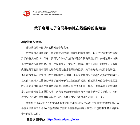 關(guān)于啟用電子合同并實(shí)施在線(xiàn)簽約告知函